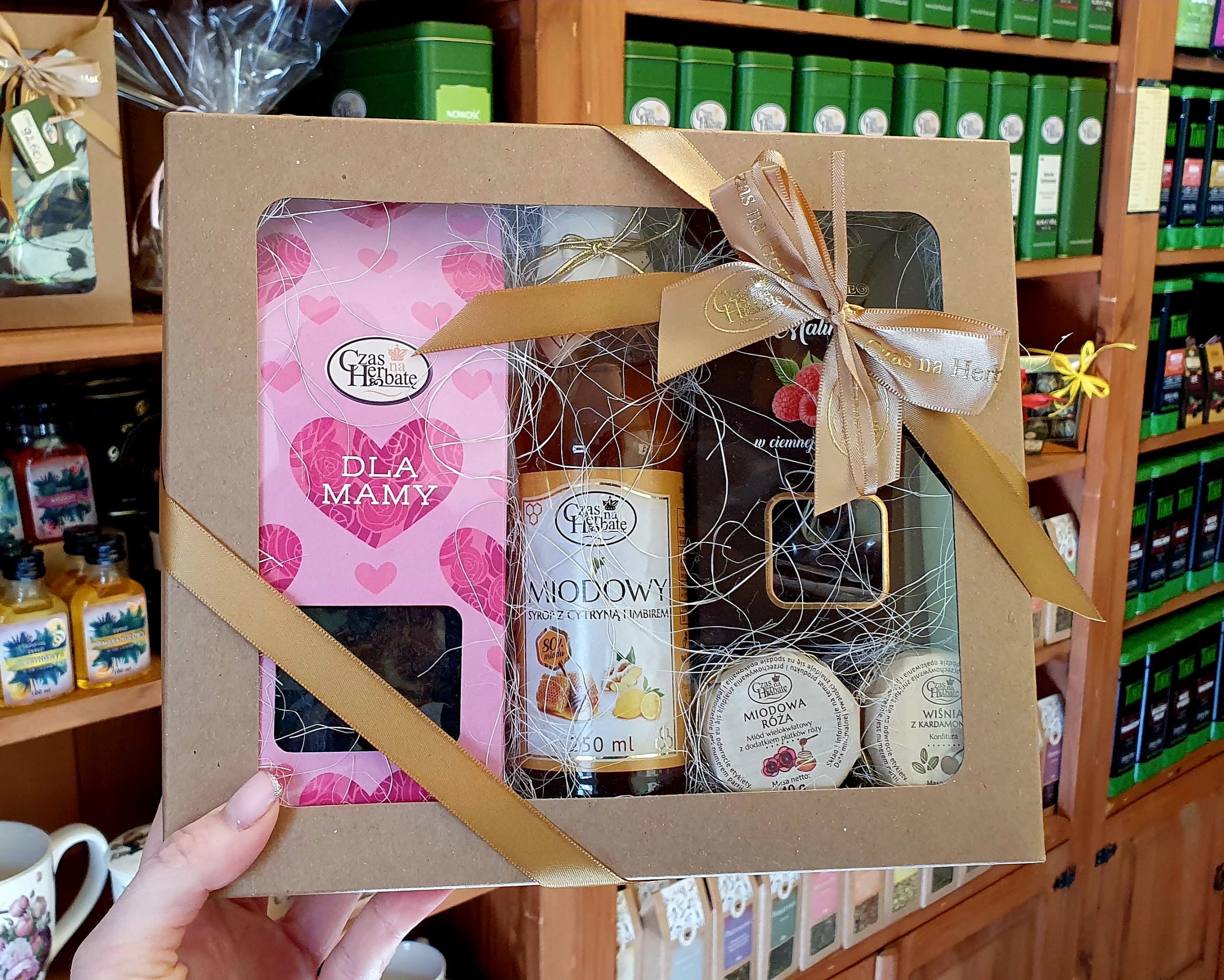 – Tekturowe pudełko z okienkiem , kokardka z logo Czas na Herbatę